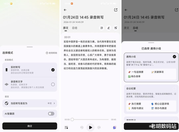 插足后,可聘用“及时转写”或“灌音转笔墨”,下方还可聘用现时转写的语音片断。试播一段,后果显赫——不得不说转写速率很快,播放的同期笔墨即刻生成,动图直不雅展示了这一进程。转写完成后,还可进行回想,提供“通用小结”与“会议纪要”等选项,功能颠倒王人全。