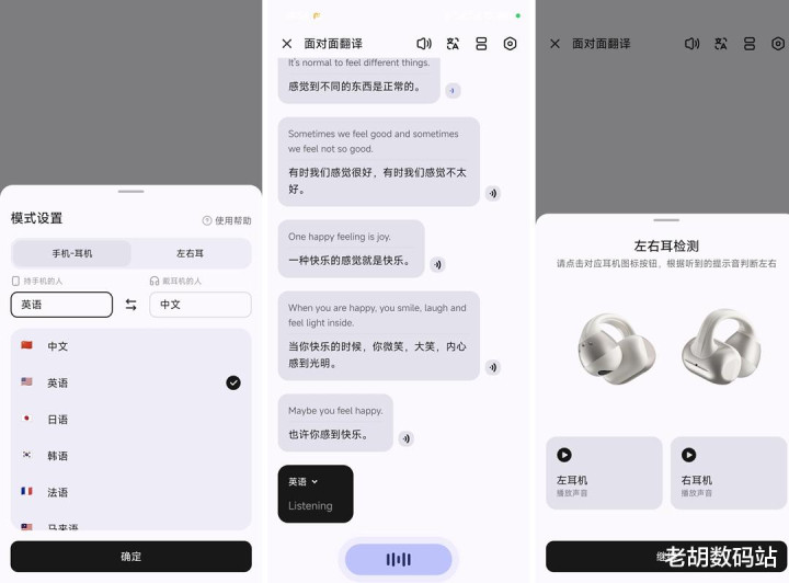 面临面翻译:这个可以甘休和番邦一又友聊天了。操作很毛糙,选好话语后,系统会及时识别并翻译两边的对话。实测下来速率很快,对方说完,简直能坐窝在耳机里听到翻译。