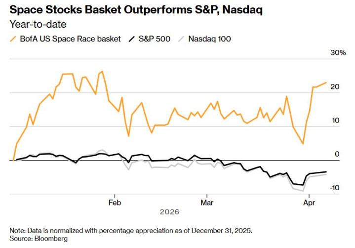好意思国银行汇编的一篮子好意思国天际股票——这些公司是天际竞赛中的要津参与者和潜在受益者——本年已大幅高潮23%,比拟之下,标普500指数下降3.4%,纳斯达克100指数下降4.2%。