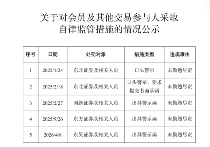 而后,国新证券(2025年2月)、东方证券(2025年9月)、东吴证券(2026年4月)也区分因未发愤尽责,被北交所出具警示函。